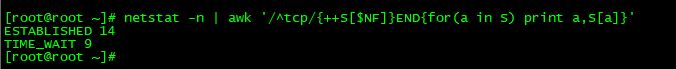 Linux的检查代码:netstat -n | awk '/^tcp/{++S[$NF]}END{for(a in S) print a,S[a]}'
