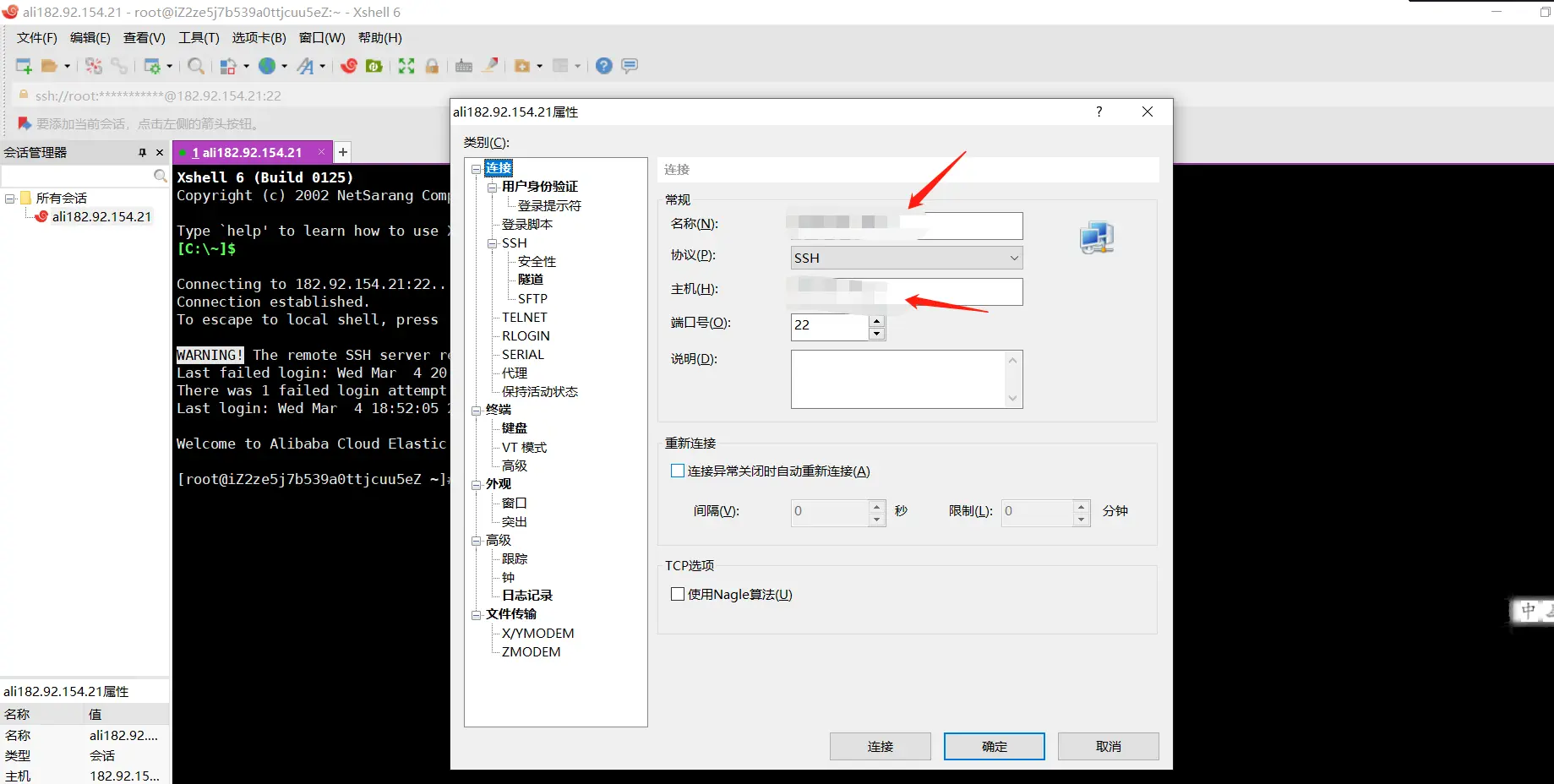 5.打开xshell6连接你的虚拟机,注意连得ip是公网ip,私网ip是连不上的