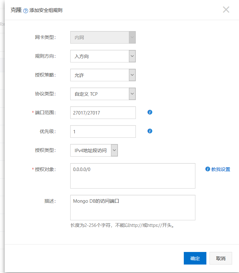 5.添加内容如下,其中端口范围是服务器暴露的端口是什么,优先级1为最高,授权对象为能够访问的ip地址,配置完成之后电脑即可访问。