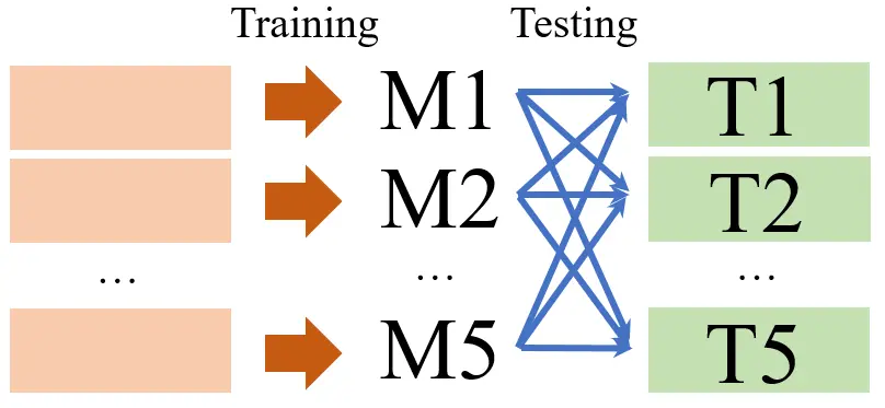 但目前预测任务的配置,例如所需模型的数量以及模型的应用范围,仍然是一个开放性问题。为了深入研究此问题,该团队进一步验证多任务设定而非单任务设定,也即观察多个模型在多个测试集上的性能。在一个实际建筑物中,使用了从冷机1到冷机5的训练数据集训练了5个模型(以下称为M1 - M5)。然后在另外5个测试数据集(T1 - T5)的不同场景中测试了5个模型的性能。实验及其结果分别如图5-1、5-2所示。