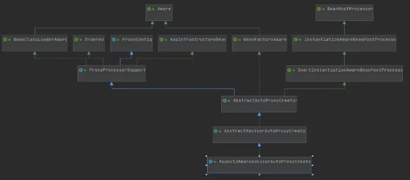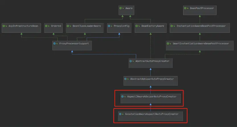 可以看到AnnotationAwareAspectJAutoProxyCreator是AspectJAwareAdvisorAutoProxyCreator的子类,AspectJAwareAdvisorAutoProxyCreator是解析<aop:config/>的时候使用的。