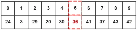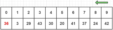- 初始数组如下图所示,取第一个数为pivot, 此时:left = 0, right = 9, pivot = arr[0] = 36; 此时将left = 0的位置就相当于一个坑,left先不变,right-- 从后往前小于pivot的数。