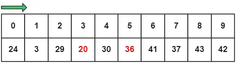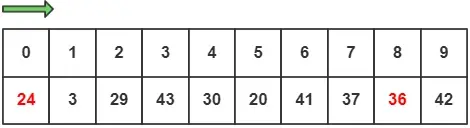 - 当 left=0,right=8时,将arr[8]放入arr[0]的坑中,此时a[0]为24,arr[8]就是坑,然后调换顺序,从前往后找比pivot大的数(left ++,right不变)。