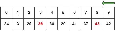 - 当left = 3, right = 8时,将arr[3]放入arr[8]中,此时arr[8]为43,arr[3]就变为坑。 然后调换顺序从后往前找比pivot小的数(left不变,right--)
