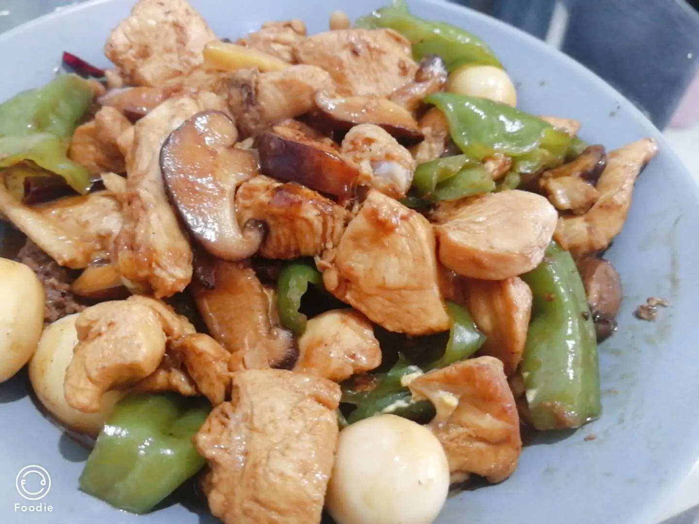 起锅放油,一定要多放点油,不然鸡肉不好吃,将鸡块煎一下,然后倒入水,放入酱油等调料,香菇,鹌鹑蛋,一起炖。最后放入青椒(是为了好看,也可以不放)。等汤汁收到差不多了,装盘。
