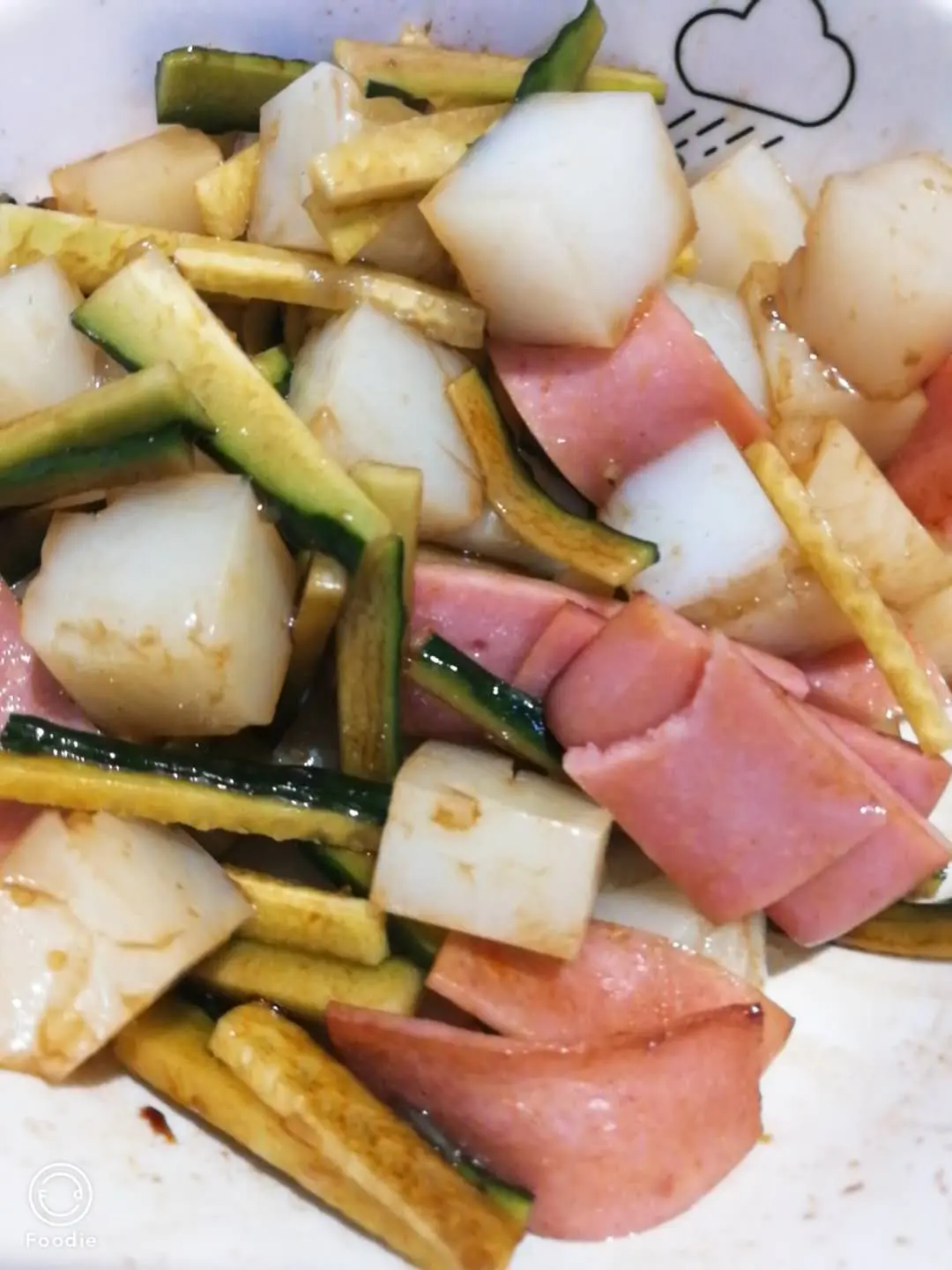 晚上少吃点,来个拌凉粉,竟然是要减肥的人,不能太放纵了。但是得加点肉,不然真吃不下去。所以煎了点火腿,太香了。