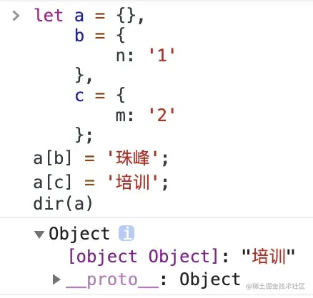 a[b]还是a[c],他的属性名都是字符串[Object,Object],后面的会覆盖前面的值,输出为'培训'