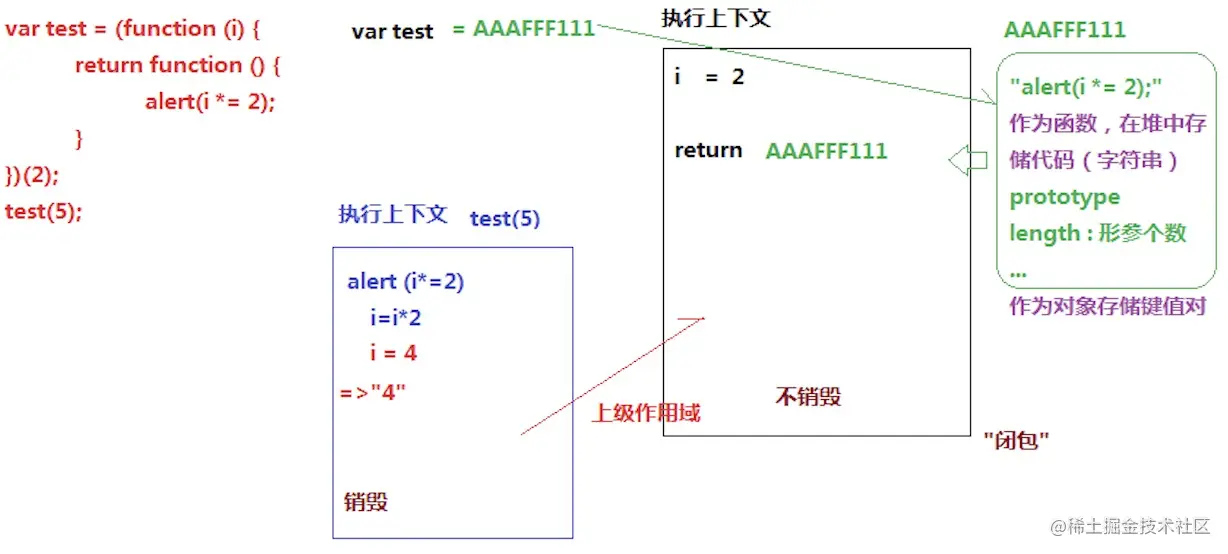 代码中return一个函数,也即return一个16进制的地址(图中AAAFFF111) 当前函数的上级作用域是属于当前这个执行上下文所在的作用域。