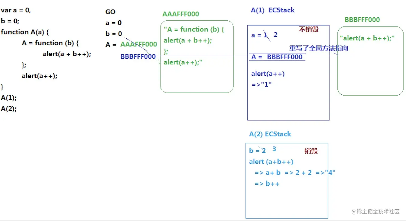 形参a赋值为1,让A = function B(也会形成一个堆BBBFFF000,存一些代码字符串),js中是严格区分大小写的,AAAFFF000中a是自己的私有的值为1,而A不是自己私有的,则往上级作用域找,即全局下的A (往上级作用找,找到A,并把AAAFFF000改为BBBFFF000,从而重写了全局方法A指向),此时闭包则形成了。