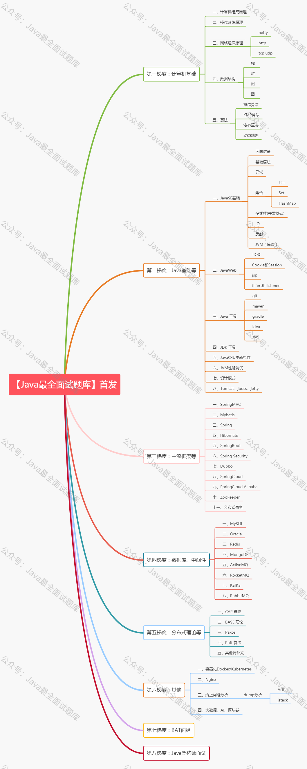 因为细写可能无止境,毕竟java的知识点太多太多了,所以思维导图目前是粗略地将大部分技术栈列出来,后续每日发文时再进行迭代更新,最终形成一套详细完整的Java面试思维导图。