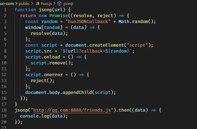 在跨域的时候,由于当前浏览器不支持CORS,或因为某种原因不支持CORS,我们必须使用这种方式来跨域。方式:我们请求一个js文件,这个js文件会执行回调,回调里面就有我们要的数据(回调名字是随机生成的一个随机数,我们可以把这个名字以callback的参数传给后台,后台会把这个函数返回给我们,并执行。)