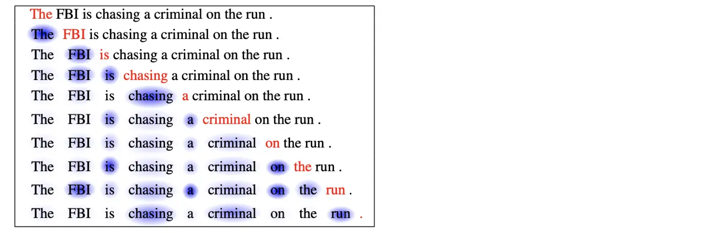LSTMN增量读入一次新的词,并计算当前词与之前写入memory的词之间的attention。效果如下图所示。