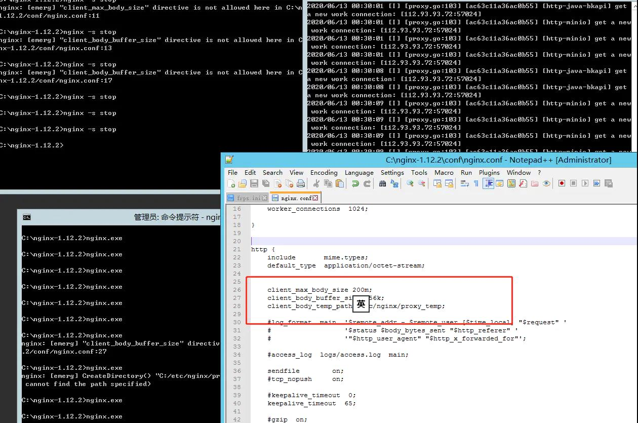 http { include mime.types; default_type application/octet-stream; client_max_body_size 200m; client_body_buffer_size 256k; client_body_temp_path /etc/nginx/proxy_temp; }- 这样子配置,虽然可以解决frp上传文件过大而报错的情况,但是上传文件速度很慢