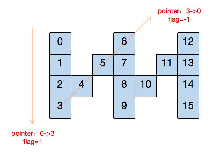 我们可以发现每当遍历numRows=4 个字符,pointer就从 0->3 转化为 3->0。所以我们可以用一个flag记录pointer的变化量。