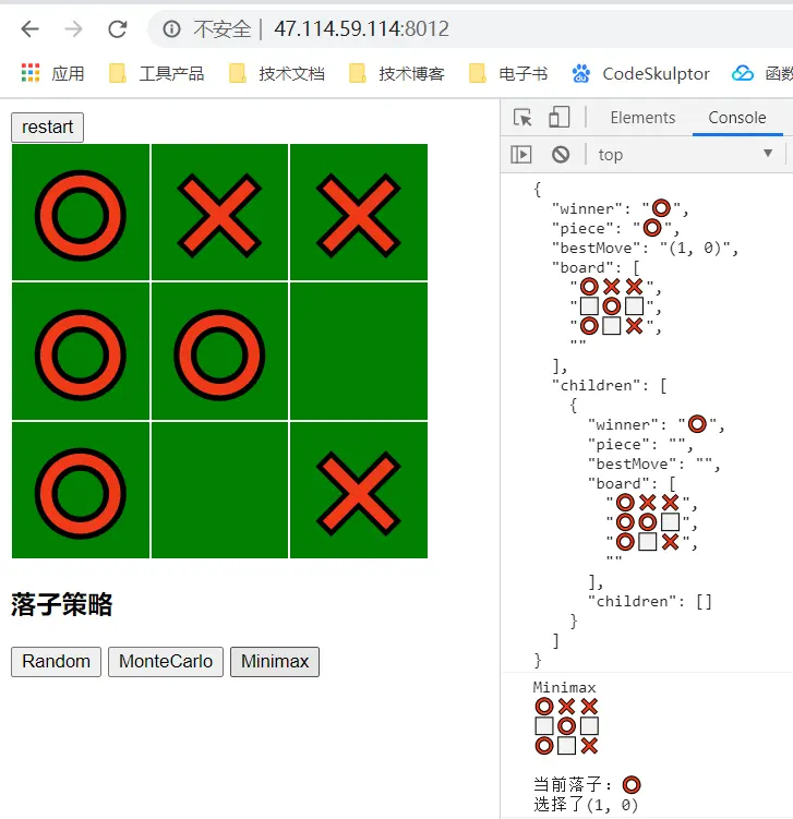- 落子(move),然后切换棋子(switchPiece),直到检查(checkWin)到棋盘分了胜负(PIECE_O|PIECE_X|DRAW)。