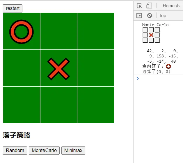 0.创建一个和棋盘一模一样的记分板 1.在当前的棋局进行多次训练,把棋局进行到已分胜负 2.根据每次训练结果更新记分板,胜子位置分数+1,负子位置分数-1 3.统计出所有胜率最高的落子位置,随机选择一个