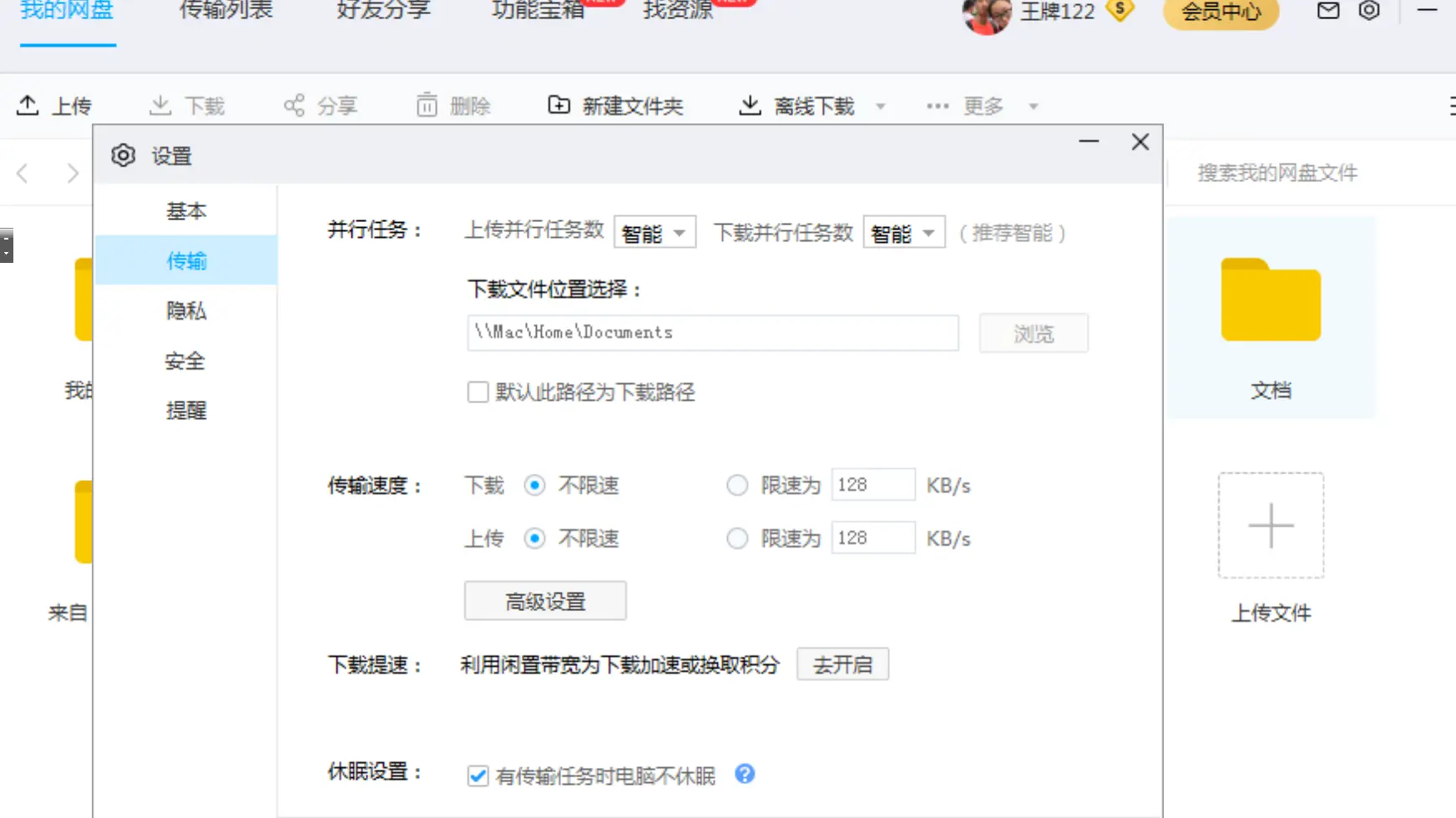 2、点到设置->传输->下载提速功能。点击去开启。