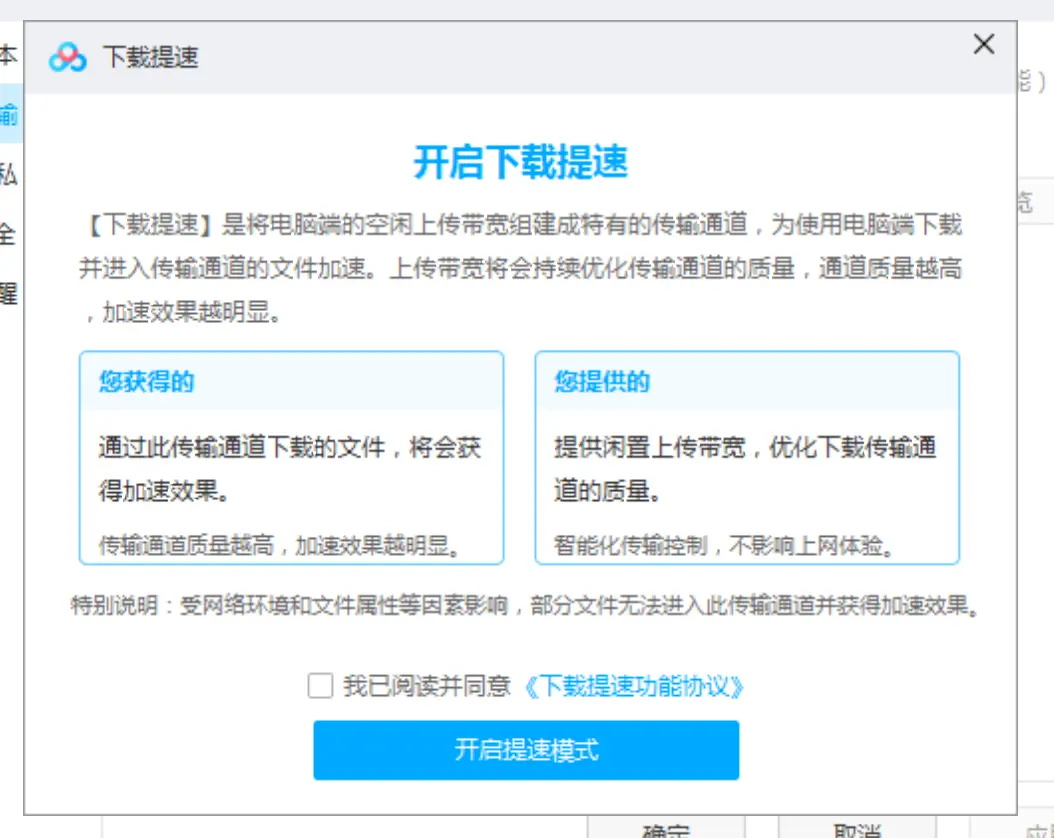 开通下载提速功能是有前题的:要提供闲置上传带宽,通俗的讲就是别人下载文件时刚好你本地有这个文件时,你要贡献一部分带宽,就是让别人下你本地文件的一部分。