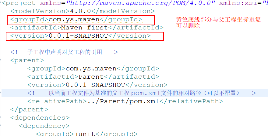 ③、将子工程的坐标中与父工程坐标重复的内容删除(不删除也可以,为了简洁)