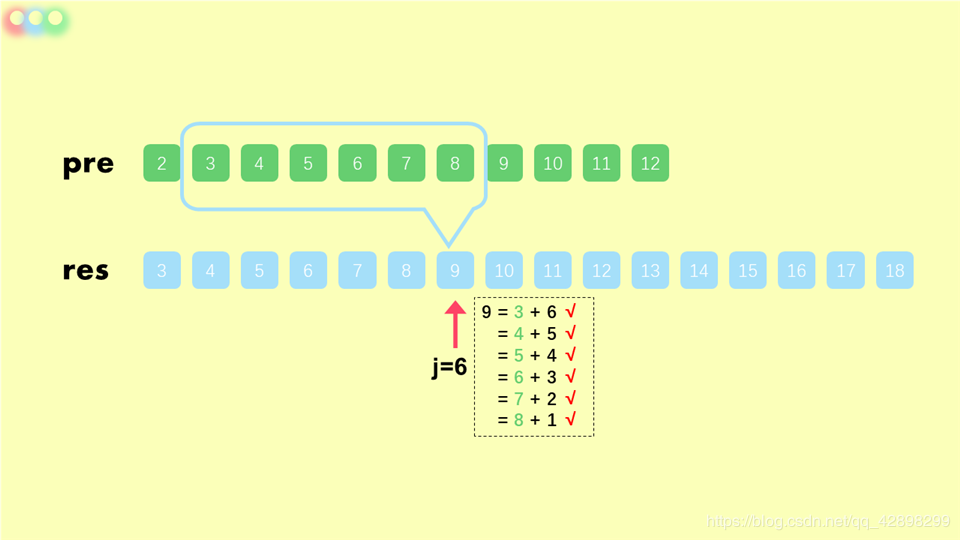 如下图,第一行pre是n=2的所有可能的和,第二行res是n=3时所有可能的和。一般情况下,例如res[6]=9,9可以由pre的3~8加上1~6里面的数来表示
