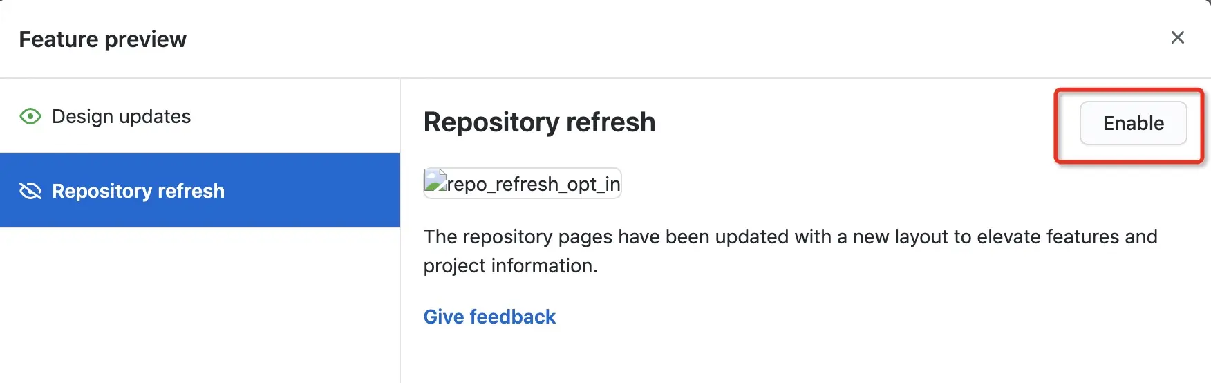 找到 Repository refresh,点击 Enable 就能开启查看仓库最新页面的能力