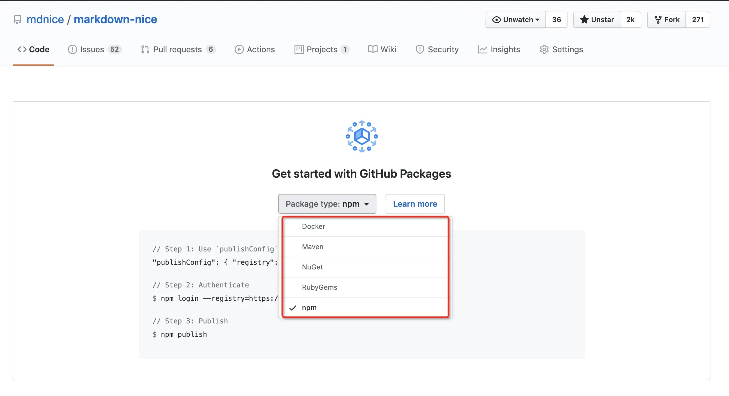 可以看到 GitHub 支持多种包的发布,包括 Docker、Maven、npm 等,入口位置比旧版更明显