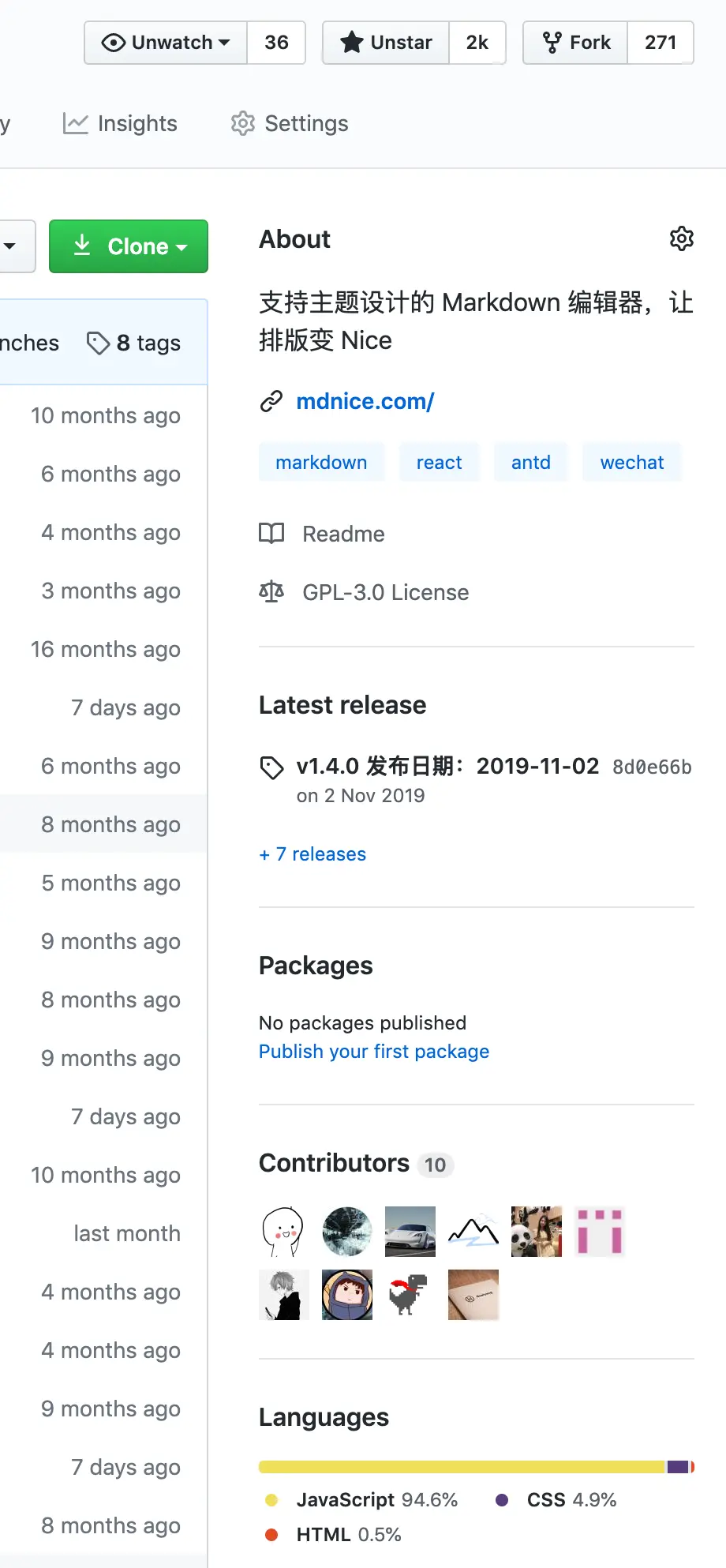 - 基础信息中突出了 Readme 的链接、开源协议、最新 release 的版本内容、GitHub 自建的包发布仓库、贡献者列表和语言占比