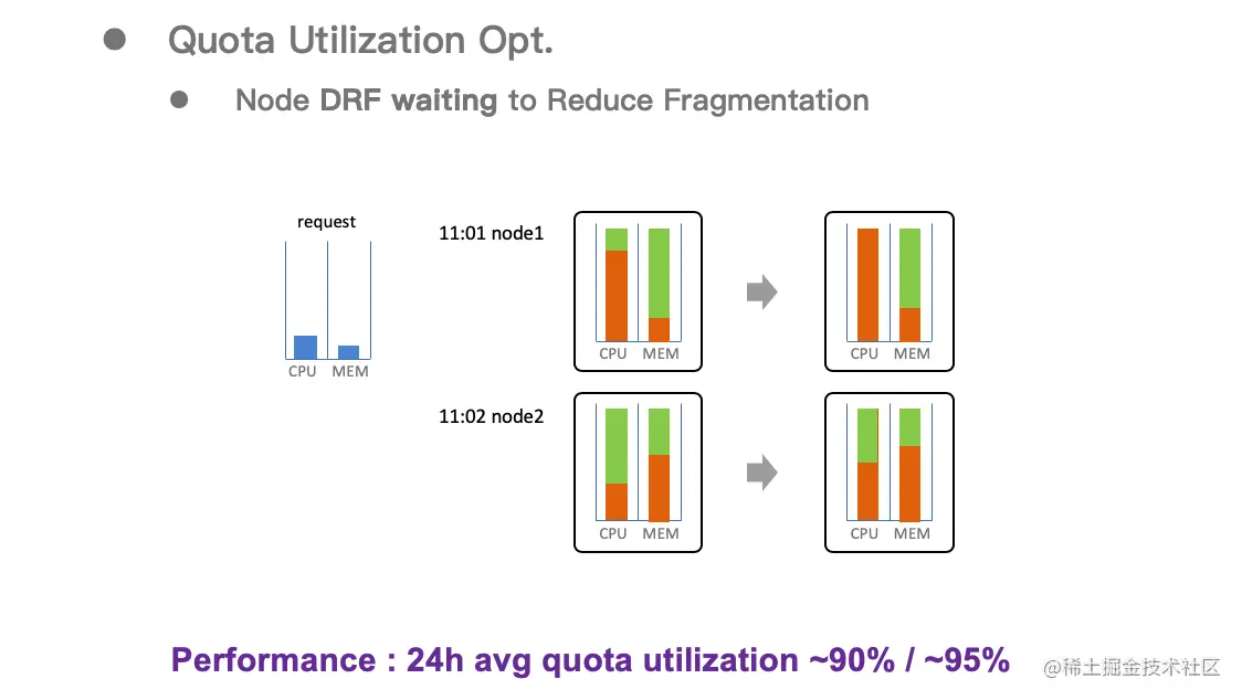 通过引入这个机制,集群资源的碎片化问题大幅降低,生产环境中可以达到 CPU 和内存的 24 小时平均利用率都在 90%以上。