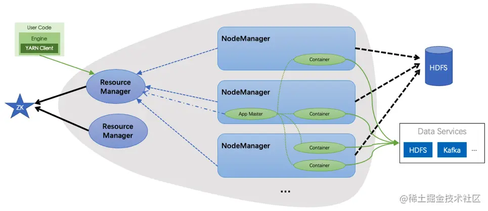 上图中灰色背景区域是 YARN 的主要架构, 主要包含两种角色: