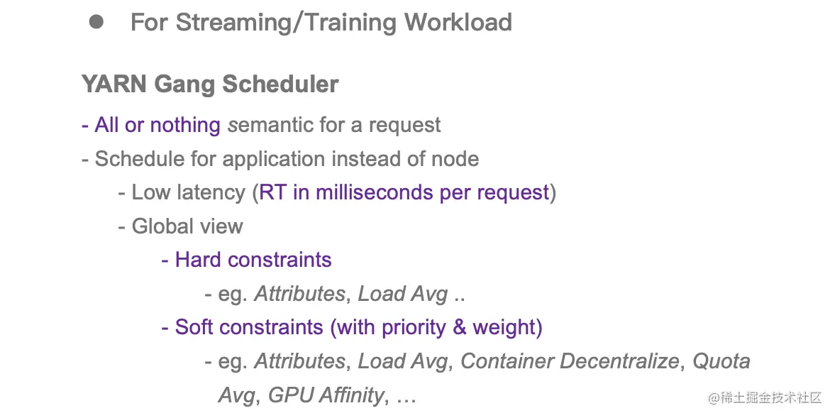 流式作业和训练作业的调度需求与批处理有很大的不同:批处理强调的是高吞吐,而流式/训练类型的作业更加强调低延迟和全局视角。为了弥补原生 YARN 在低延迟和全局视角上的缺陷,我们开发了一个全新的调度器 Gang Scheduler。