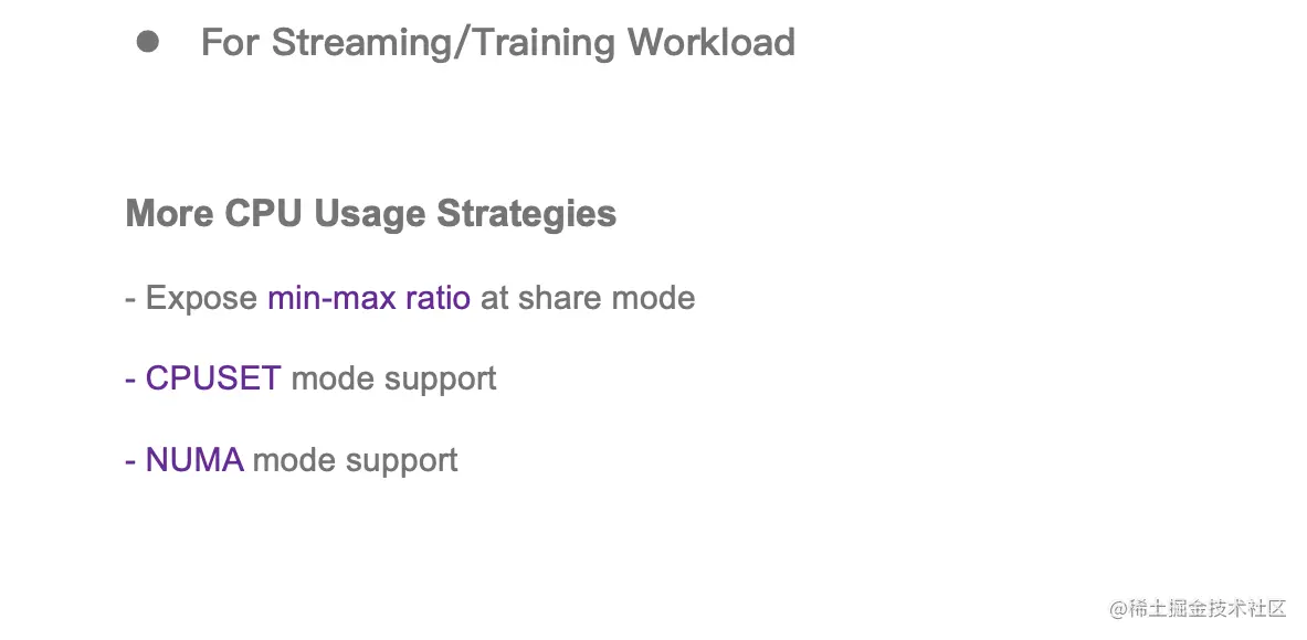 除了开启 YANR 原生默认支持的 CGroup 限制之外,我们还配置了更加丰富的 CGroup 管理策略,比如在 share 模式下支持自定义的最大值限制,支持绑核,支持绑 NUMA 节点等. 通过这些措施,给流式作业和训练作业更加灵活的管控策略,满足不同场景下的隔离或共享需求。