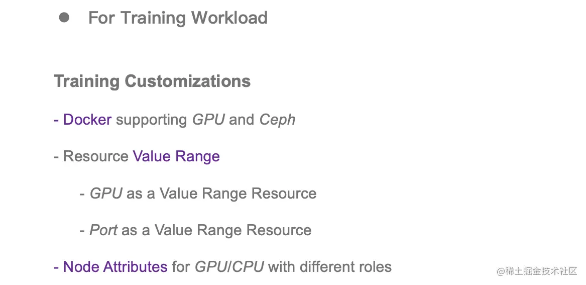 - 为了更好的隔离性,定制了支持 GPU 和 Ceph 的 Docker