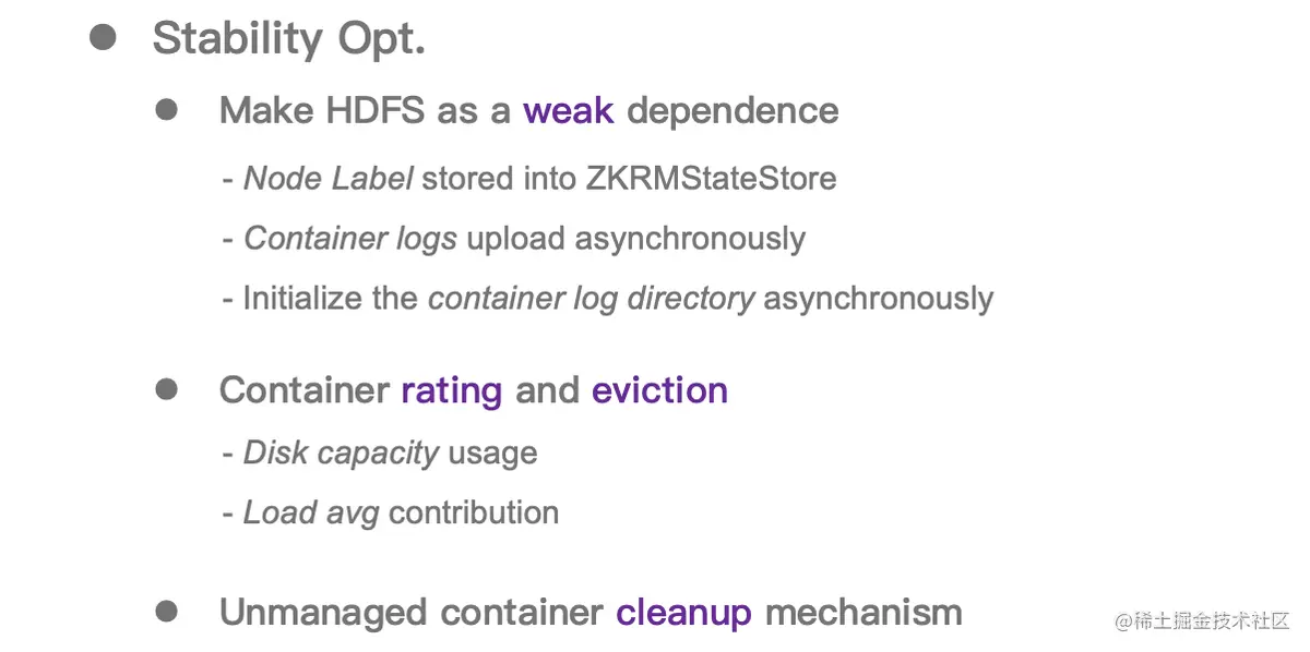 字节跳动的 YARN 服务规模巨大,在稳定性方面遇到了很多挑战,有很多细节方面的优化,在这里由于时间有限,挑选几个比较有代表性的优化点跟大家分享一下: