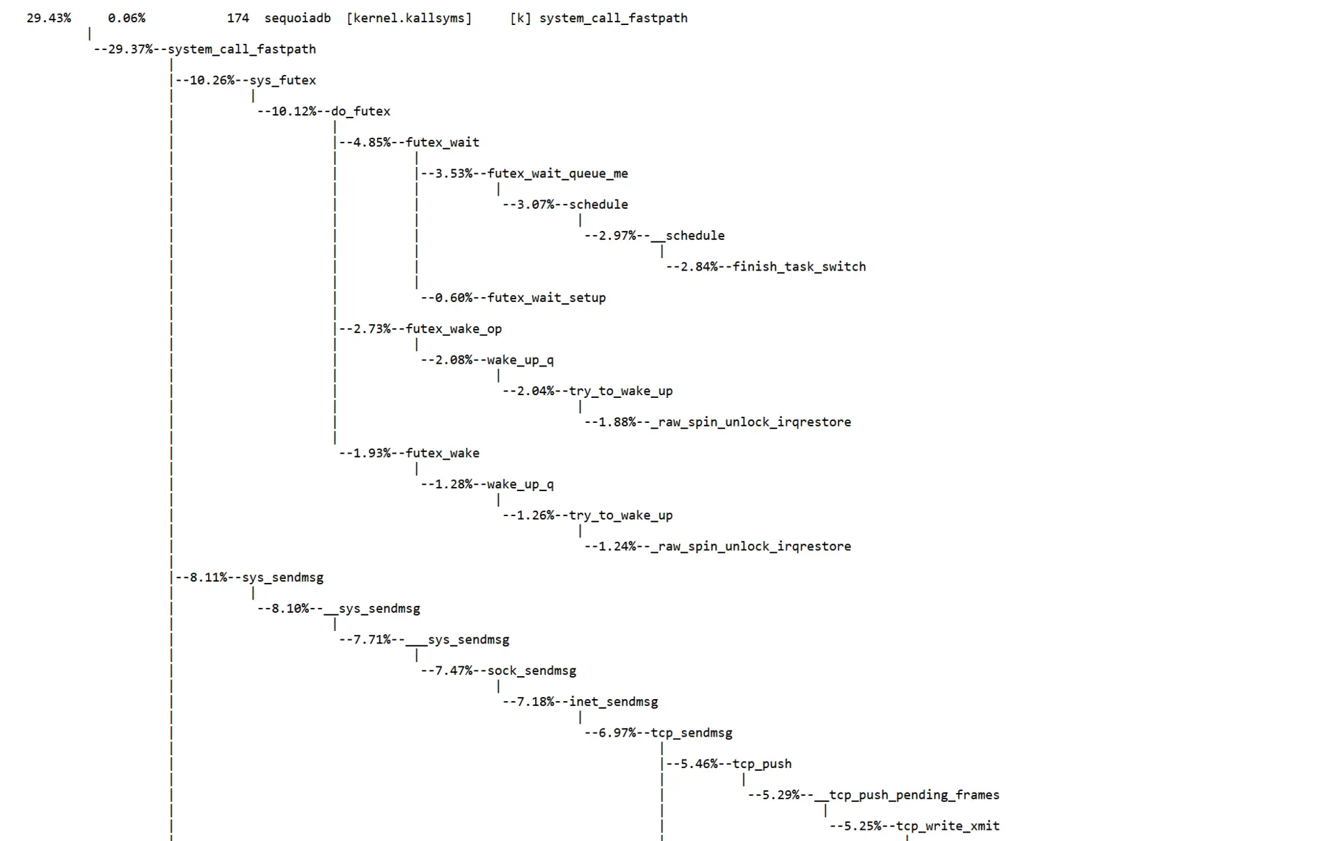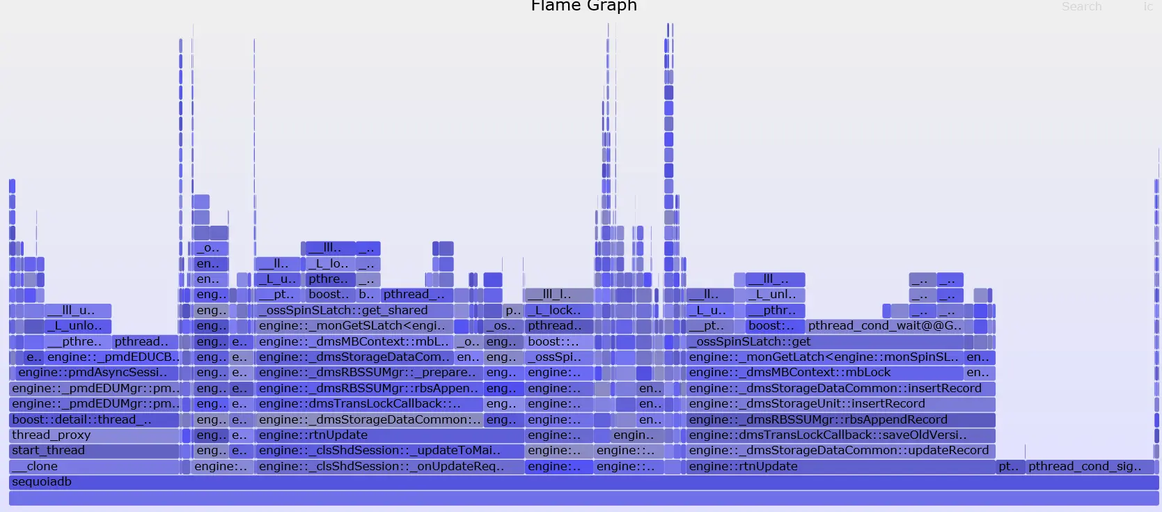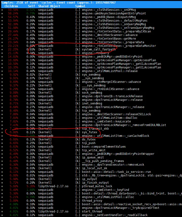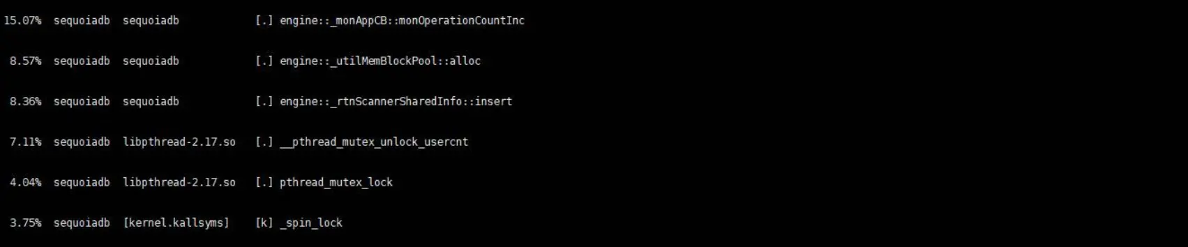 至于更精确的定位,就要perf出马了。注意的是SequoiaDB 的代码编译时加入了debug symbol,这样会带来一定的性能损失,但能够极大的方便问题诊断和定位。