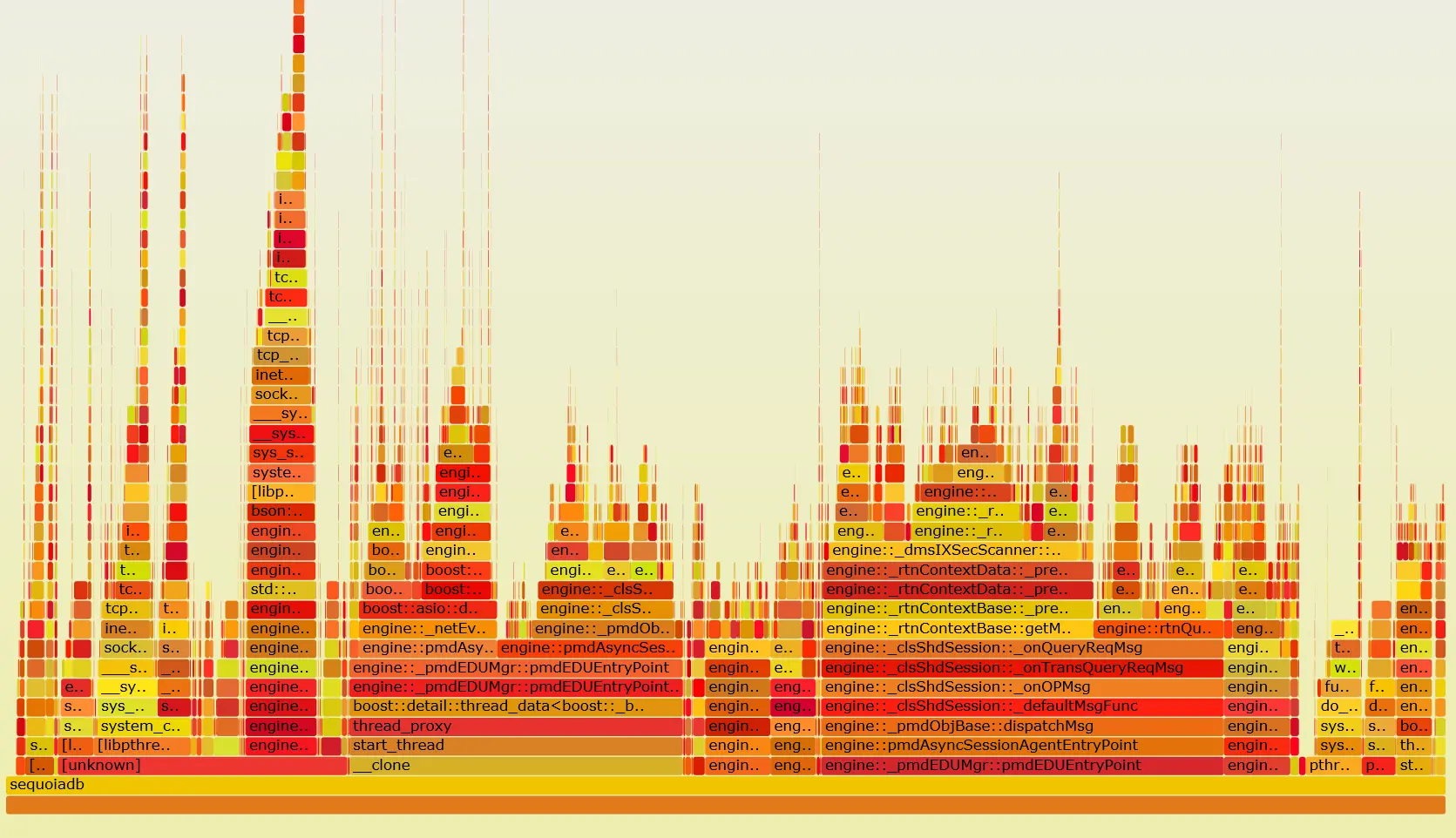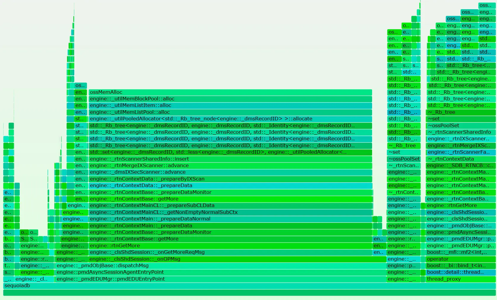这里明显看到的是很多动态内存分配发生在一个set的插入过程中。Std::set内部使用的红黑树,每次结点的插入都要进行内存分配。为了减少系统内存的动态分配与回收,SequoiaDB实现了一整套自己的内存管理机制。最开始尽量在线程预分配好的内存池上分配空间,这点和tcmalloc的原理很接近,这时的开销最小,内存事先已经从操作系统分配好了,而且本线程上分配是无锁的。但是如果线程内存池用完了,我们会到一个共享的预分配好的内存池上分配,这时会多一个锁的开销。但这两处都用完了,我们才向操作系统申请。从火焰图上看,我们基本上都走到向操作系统分配的分支中了。针对这种情况,我们优化了set的实现。当set中结点数量较小时,我们用一个flat的较小的array存放数据,避免了动态内存分配。当结点数较多时,我们再转化成树型结构以提高查找效率。但是我们会提高线程上允许的缓冲池的大小,特别是小结构线程池大小。最终我们避免了绝大多少的动态内存分配与回收,提升了系统性能。通过这块的分析,我们也反过来帮助确定那些query会用到大量数据,并优化对应的query。