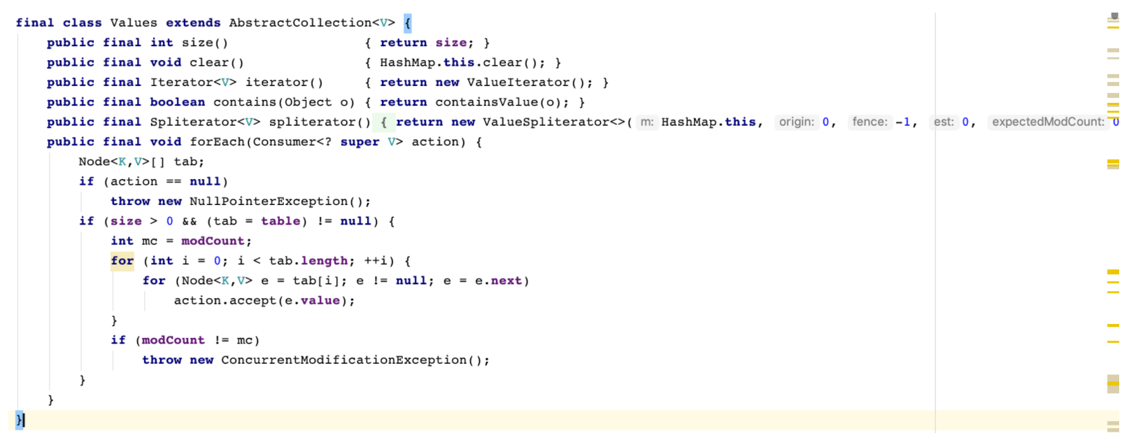 循环遍历 Map中的 values值,看一下 values() 方法最终创建的是什么: