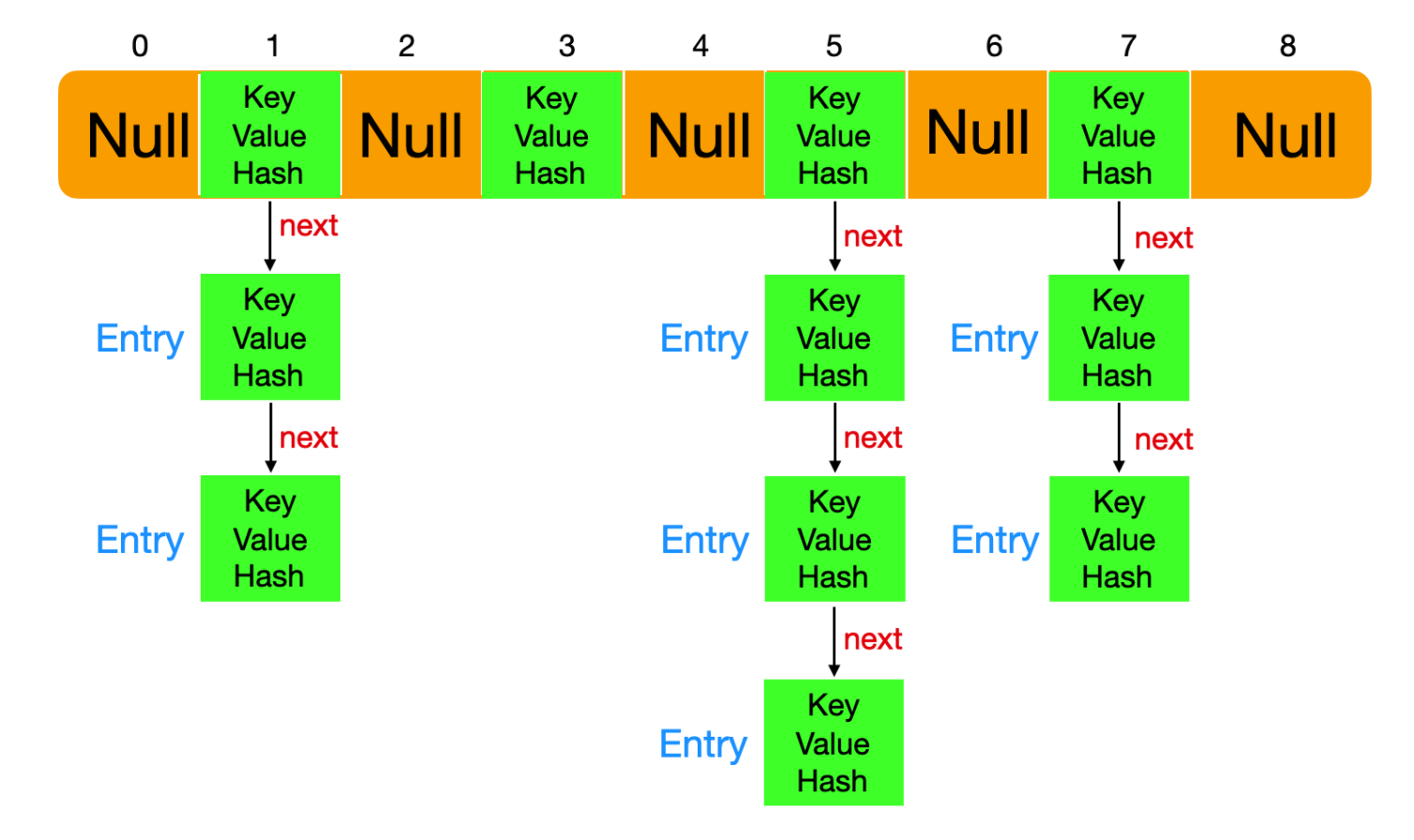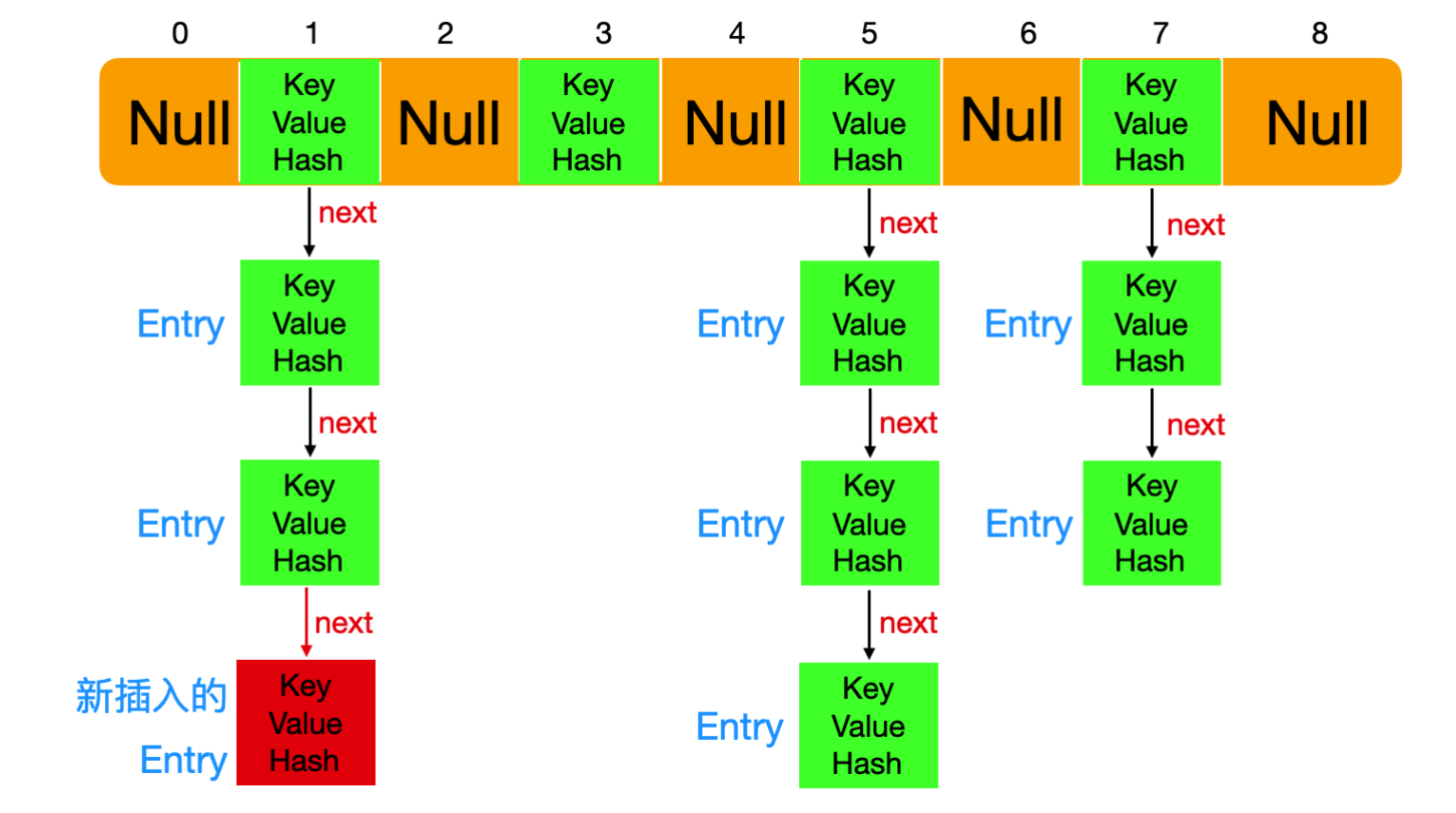 HashMap 底层是使用位桶 + 链表实现的,位桶决定元素的插入位置,位桶是由 hash 方法决定的,当多个元素的 hash 计算得到相同的哈希值后,HashMap 会把多个 Node 元素都放在对应的位桶中,形成链表,这种处理哈希碰撞的方式被称为链地址法。