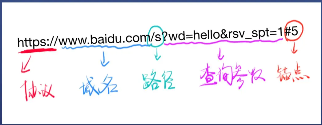 URL:协议 + 域名或IP + 端口号 + 路径 + 查询字符串 + 镖点