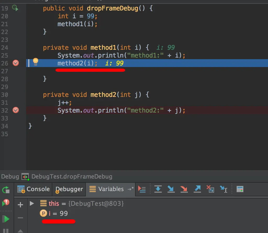 [注:好奇心是人类进步的阶梯,如果想知道为啥这个功能叫Drop Frame,而不是类似Back To Previous 之类的,可以去翻翻JVM的书,JVM内部以栈帧为单位保存线程的运行状态,drop frame即扔掉当前运行的栈帧,这样当前“指针”的位置,就自然到了上一帧的位置。]