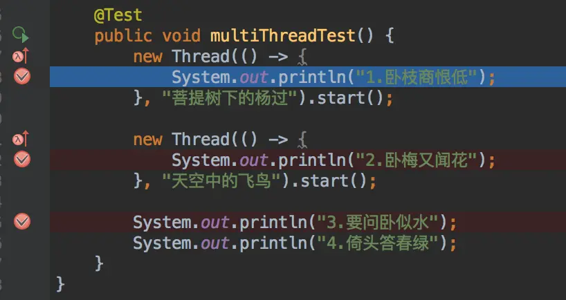 多线程同时运行时,谁先执行,谁后执行,完全是看CPU心情的,无法控制先后,运行时可能没什么问题,但是调试时就比较麻烦了,最明显的就是断点乱跳,一会儿停这个线程,一会儿停在另一个线程,比如下图: