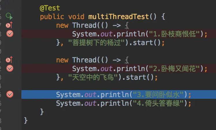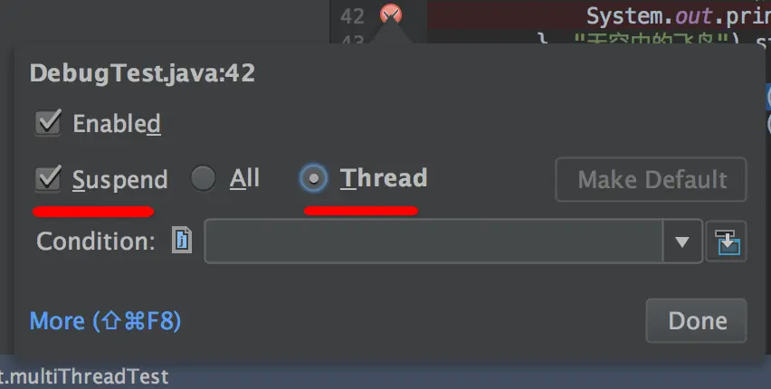 即:Suspend挂起的条件是按每个线程来,而非All。把这3个断点都这么设置后,再来一发试试