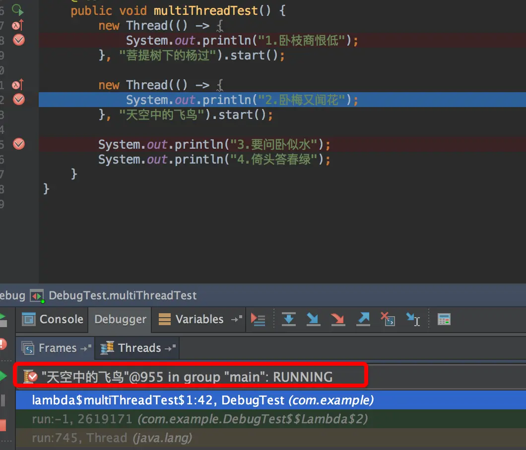 注意上图中的红框位置,断点停下来时,这个下拉框可以看到各个线程(注:给线程起个容易识别的名字是个好习惯!),我们可以选择线程“天空中的飞鸟”