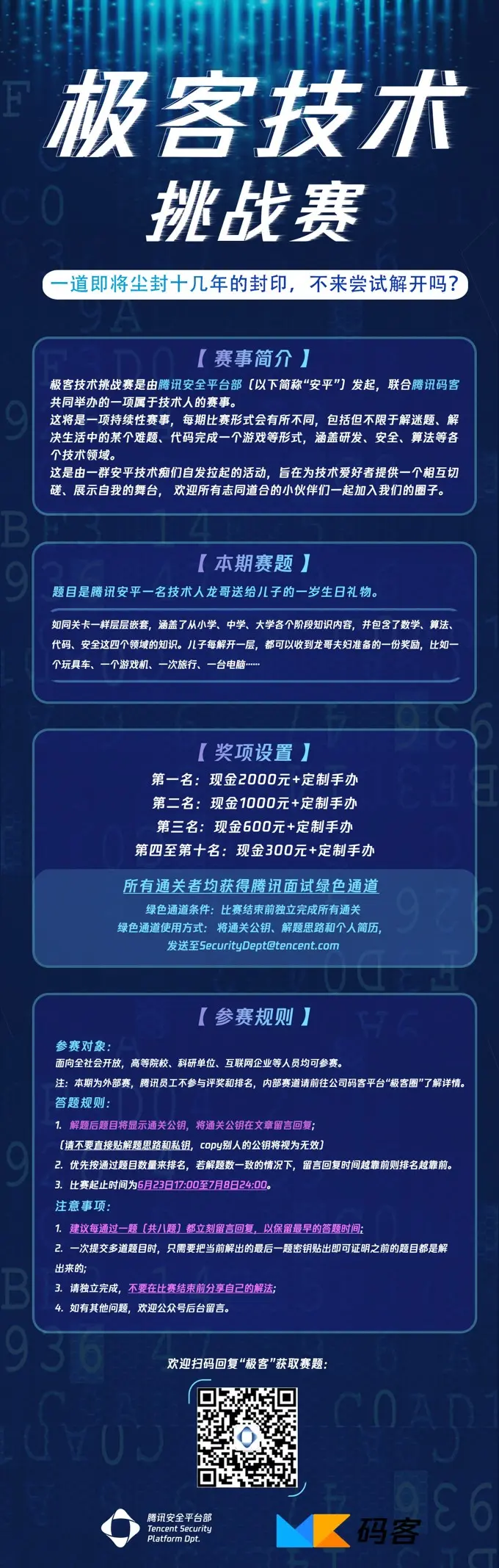 如今,这场腾讯内部的极客技术挑战赛将从鹅厂走向大众,以系列赛事的形式,向全体技术爱好者全面开放。6月23日17点至7月8日晚24点整,第一期比赛将在腾讯安全平台部官方公号“我在鹅厂做安全”正式开启,参赛者围绕“一道即将尘封十几年的封印”的神秘命题,解开层层嵌套加密的8个关卡,并将所解出最后一题的通关秘钥在文章中留言回复,即可参与这场极客间的巅峰对决。