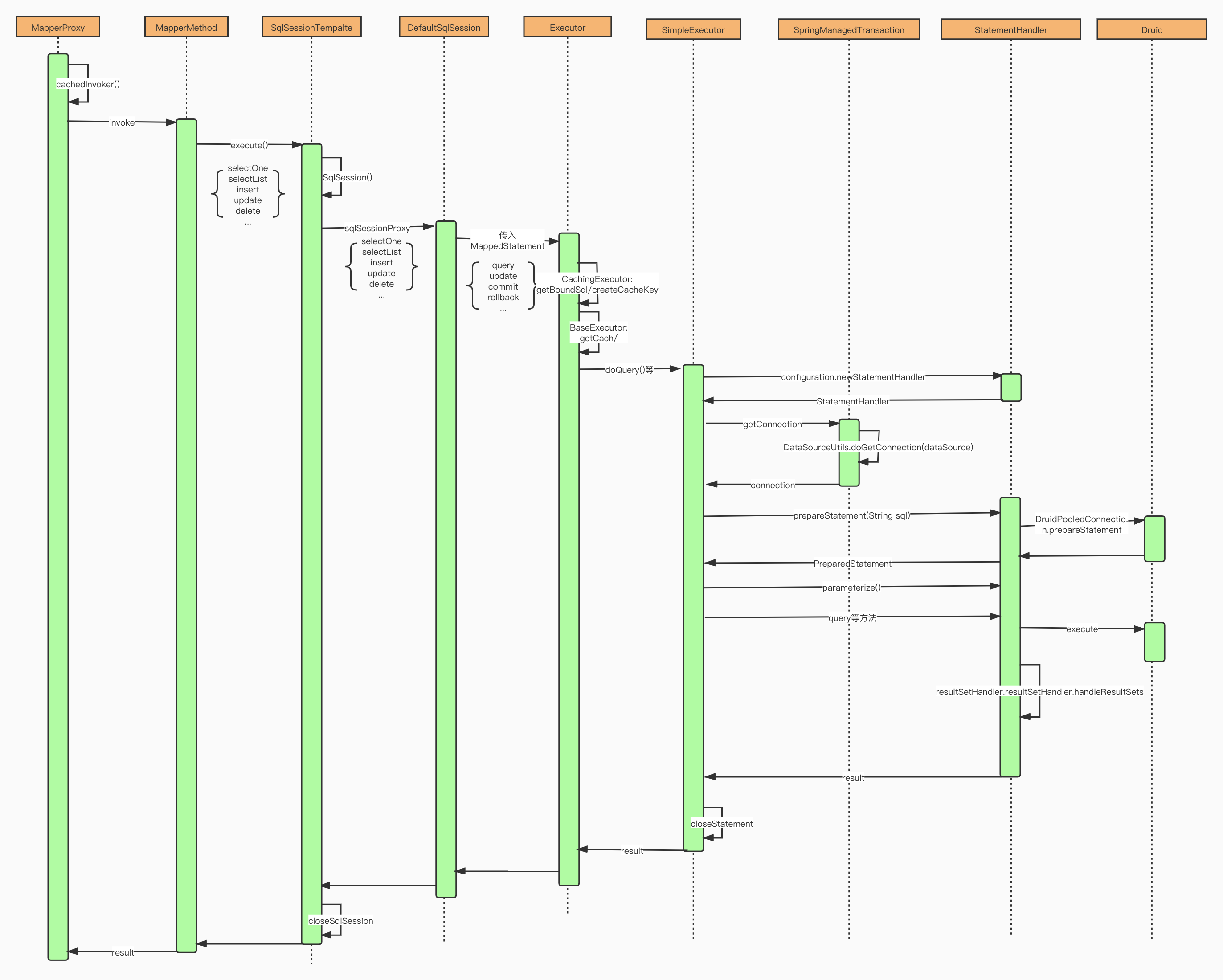 前面的章节陆续介绍了MapperPoxy的创建、MapperStatement的生成、Executor等核心组件,其实都是在为本文做铺垫。这篇我们详细介绍下Mybatis是怎么执行我们定义的sql语句的。篇幅较长,我先上张图。