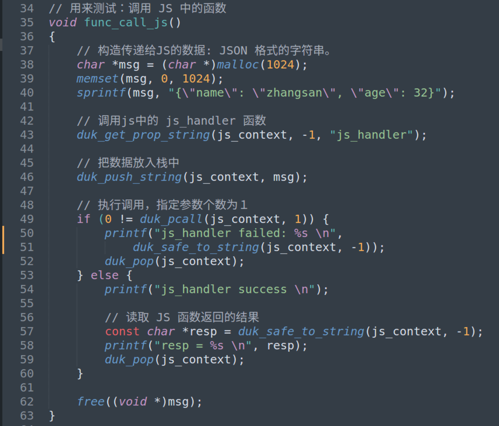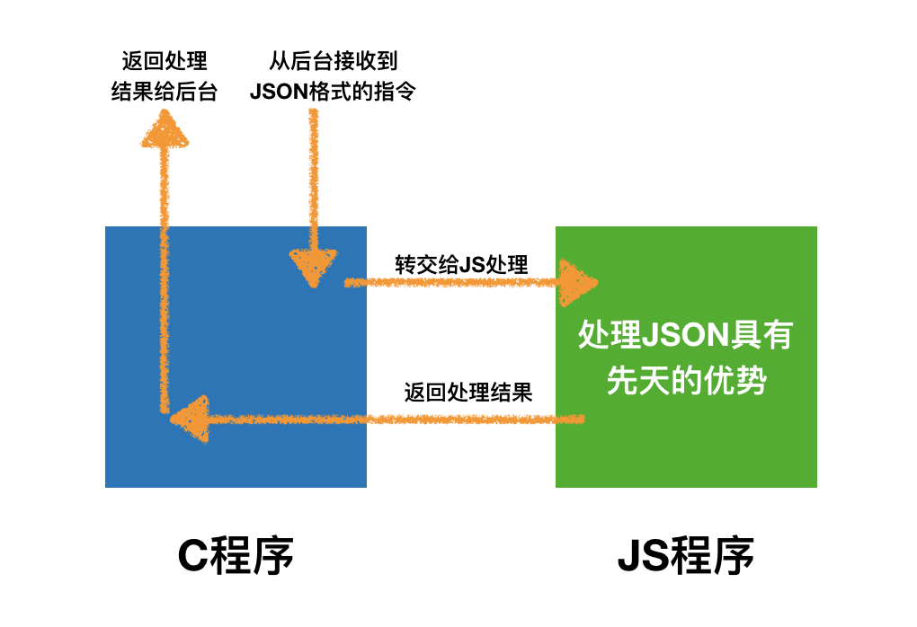 当C代码中需要对JSON格式的字符串进行处理时,把JSON数据通过栈结构传给JS程序,在JS程序中处理数据之后,把处理结果再返回给C程序中。