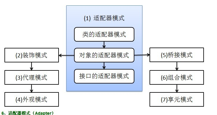 结构型模式,共七种:适配器模式、装饰器模式、代理模式、外观模式、桥接模式、组合模式、享元模式。