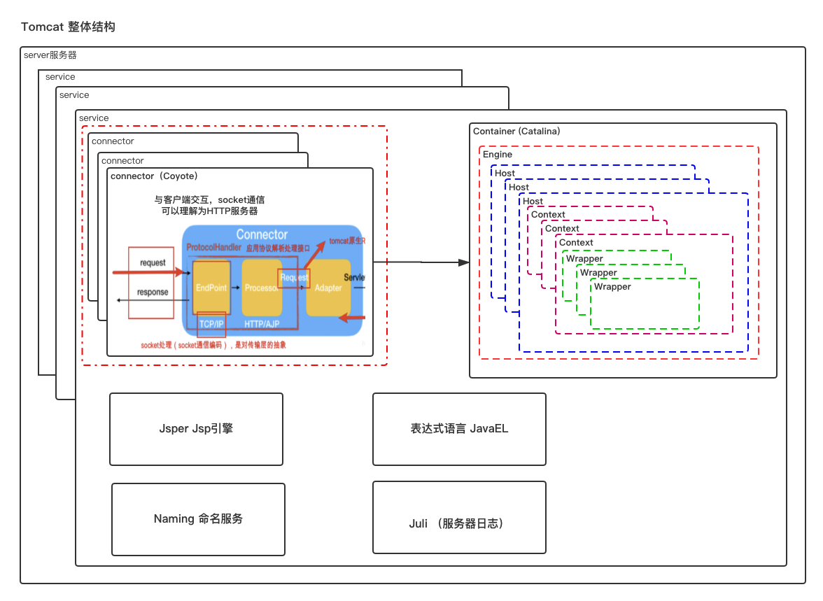 Tomcat 可以通过 (conf/server.xml)的组件构成的Web容器,⽽Catalina是Tomcat的 servlet容器。Catalina 才是 Tomcat 的核⼼。 其他模块都是为Catalina 提供⽀撑的。 ⽐如 : 通过 Coyote 模块提供链接通信,Jasper 模块提供 JSP 引擎,Naming 提供JNDI 服务,Juli 提供⽇志服务。