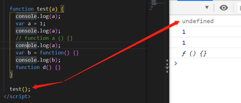 注意:函数声明整体提升定义,变量只有声明提升,赋值是不提升的