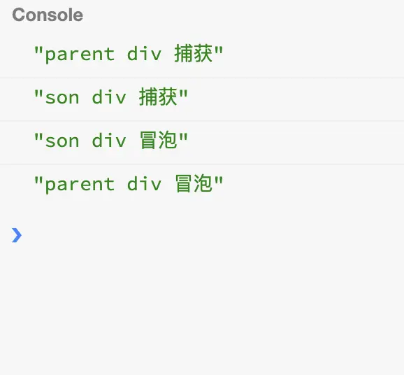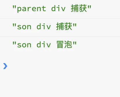 事件捕获是与事件冒泡的监听查找函数顺序相反,所以事件会从最外层开始触发监听函数直到最具体的元素,所以上面代码的click监听事件的顺序为:document->html->body->grandpa->parent->son