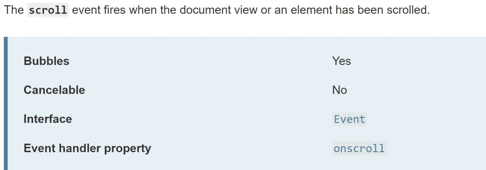 scroll event,具体请查阅MDN文档,Bubbles,表示该事件是否冒泡,Cancelable表示是否可以取消冒泡